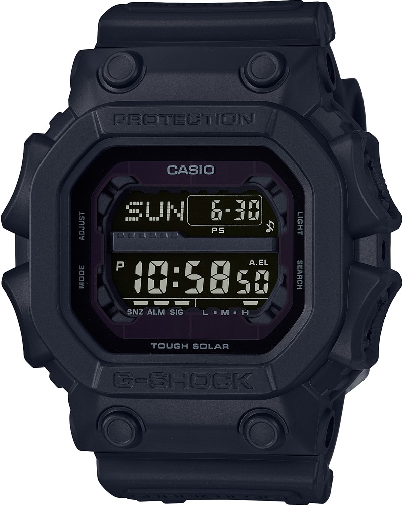 Die neuesten Modelle von G-SHOCK, der Uhr, die den Standard für robuste Zeitmesser setzt, sind in dem für G-SHOCK typischen Schwarz gehalten, das die Essenz von eintönigem Harz einfängt. Dieses Modell basiert auf der GX-56, die Stößen aus jeder Richtung standhält. Dank der schlichten mattschwarzen Oberfläche kommt die Form der Uhr selbst gut zur Geltung. Die Schließe ist mit einer schwarzen Ionenbeschichtung versehen. Alles an diesem neuen Basismodell in Schwarz spiegelt die Essenz des rauen, robusten Images von G-SHOCK wider.